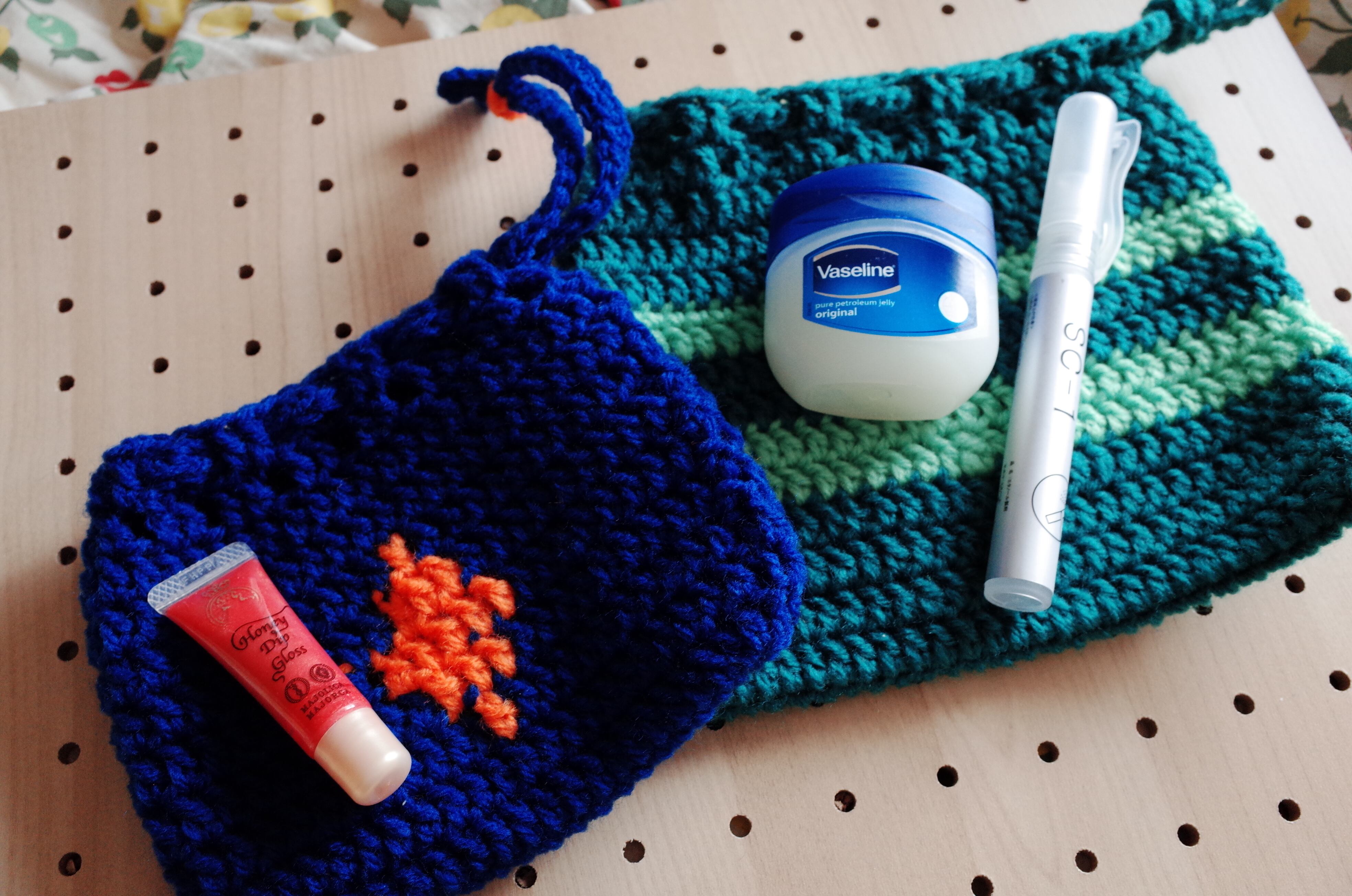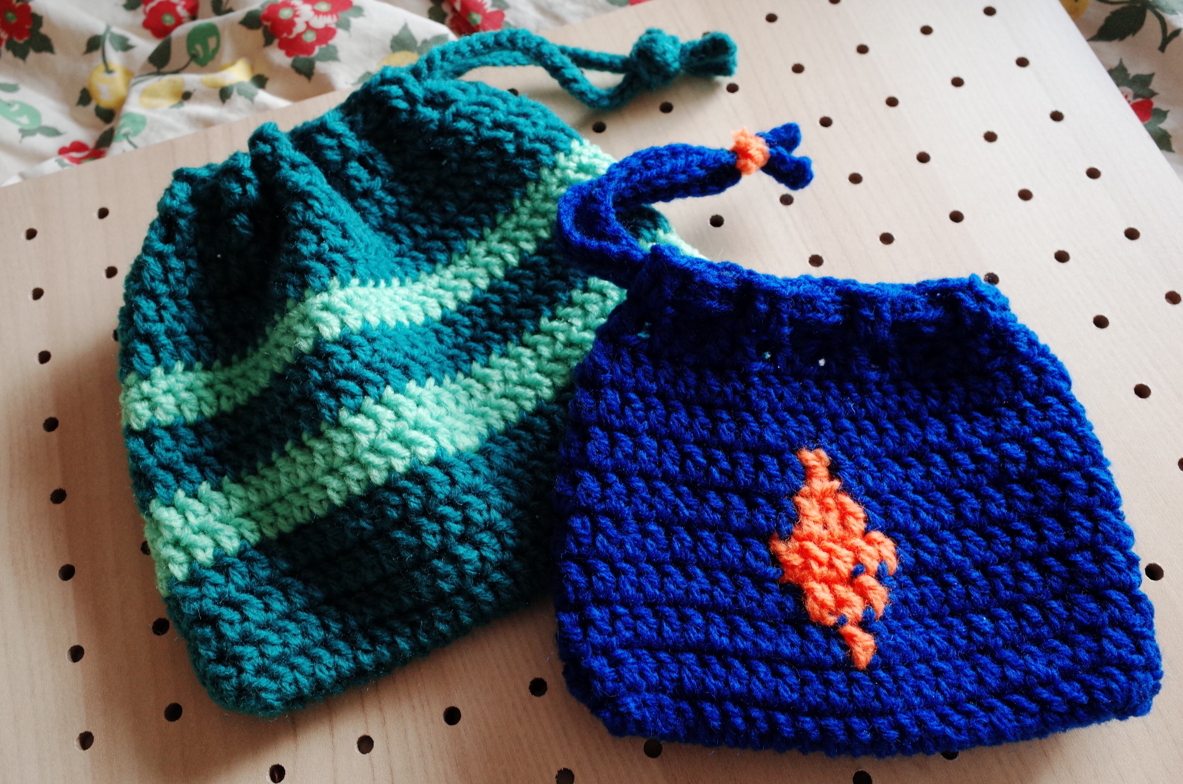 カラフルなクロシェニット の巾着ミニポーチです。