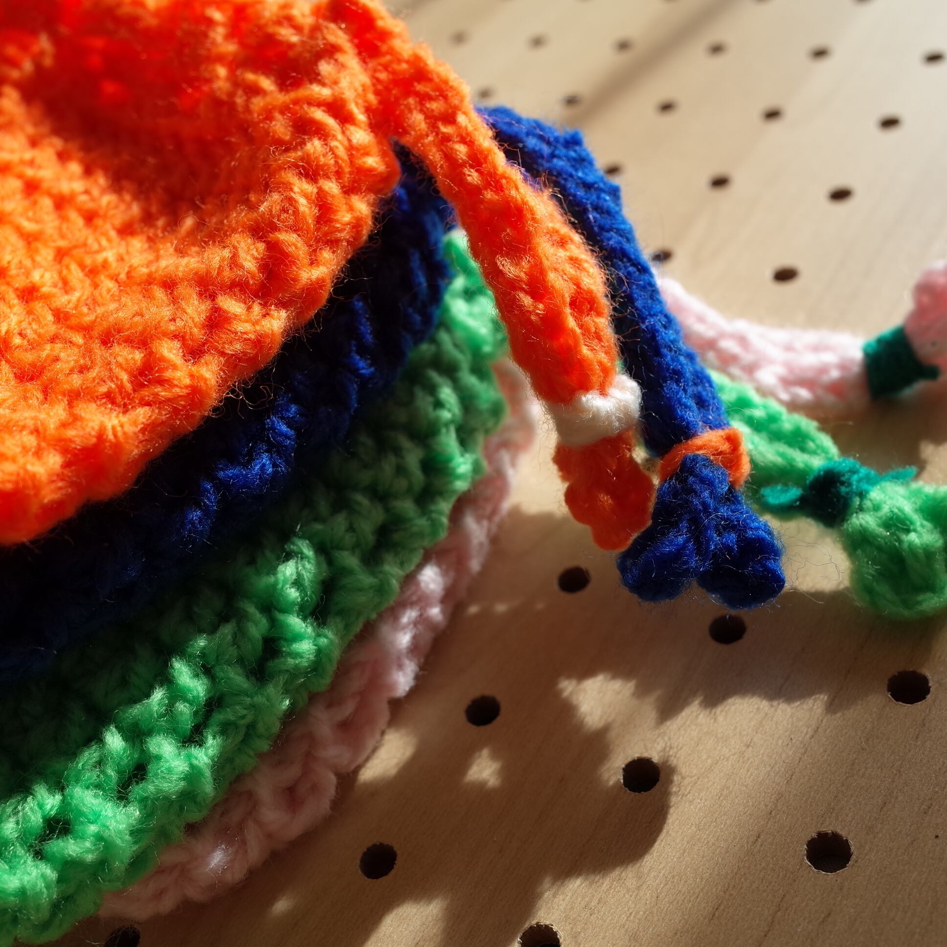カラフルなクロシェニット の巾着ミニポーチです。